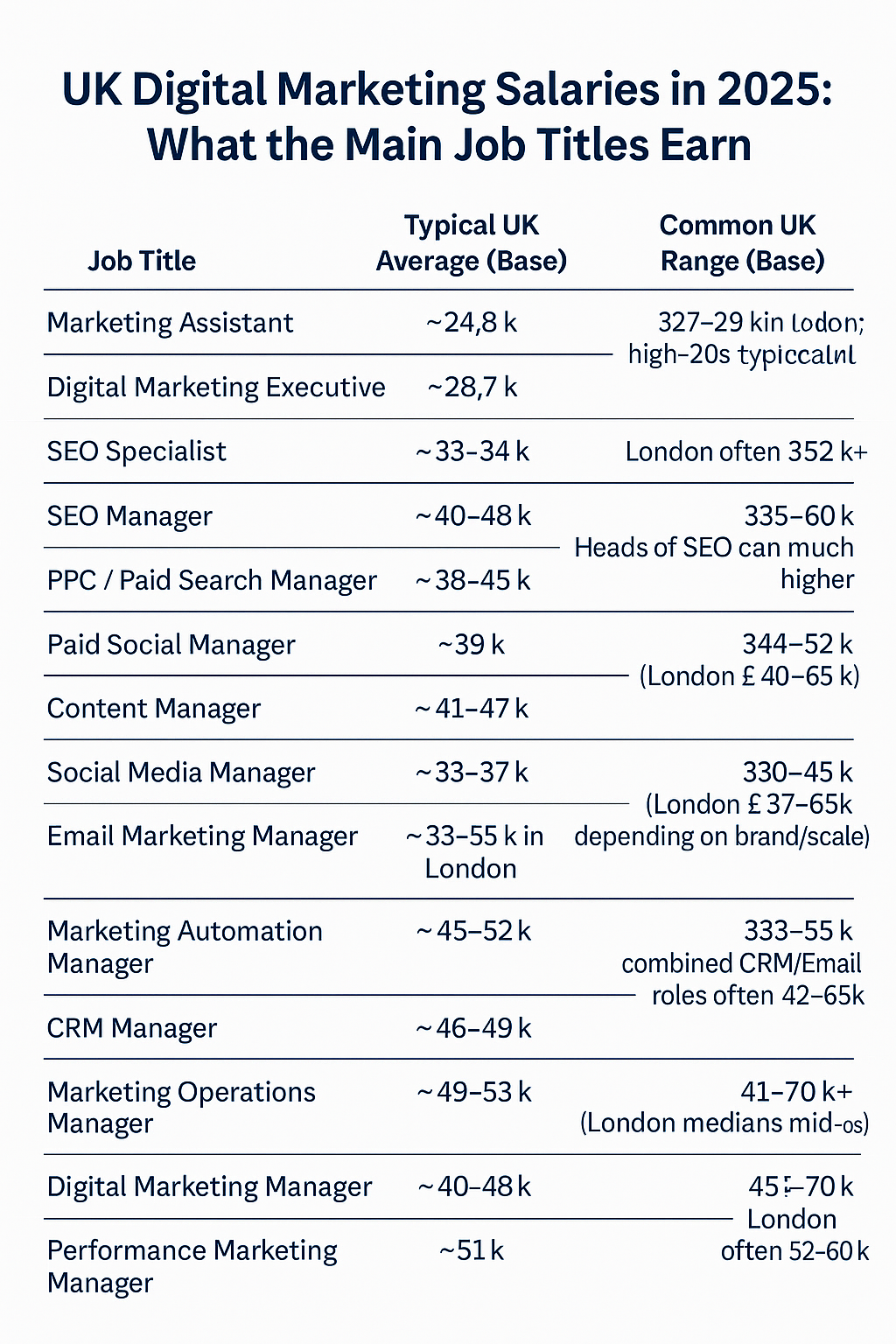 Below is an up-to-date, UK-specific guide to average salaries and typical ranges for the main digital marketing job titles in 2025, plus context on what pushes a role up or down the pay bands.
